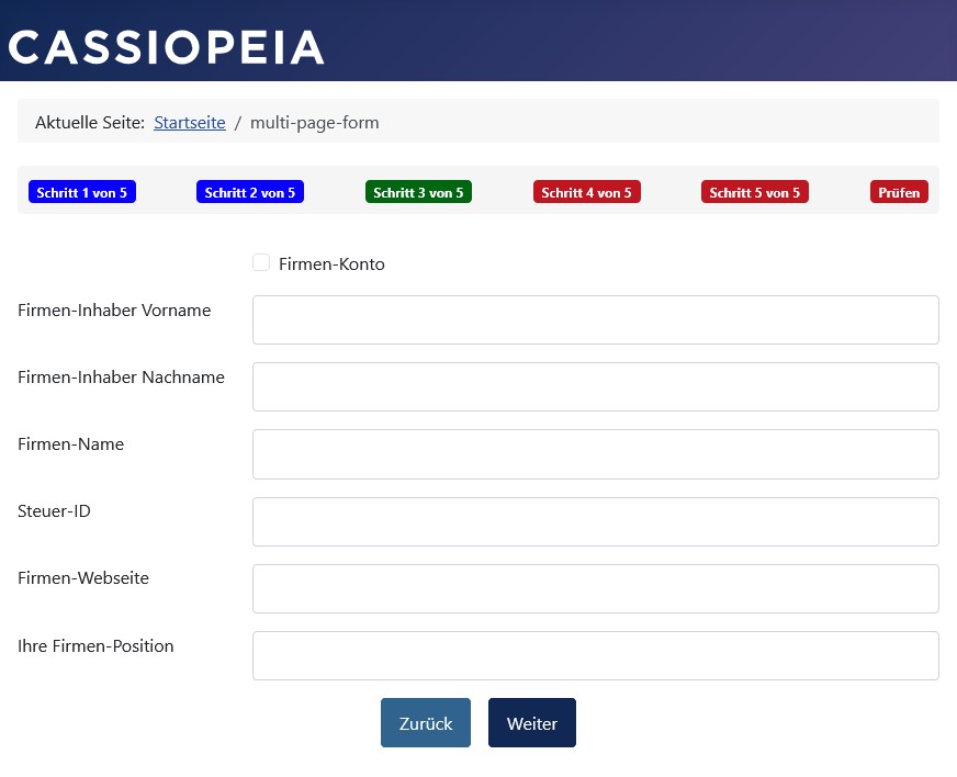 Die Voreinstellung für das mehrseite Formular ist eine deaktivierte Fortschritts-Anzeige. Der Benutzer kann durch alle Seiten navigieren, hat aber nicht unbedingt einen Überblick über bereits editierte Seiten und die Anzahl noch nicht editierter Seiten. Bei wenigen Seiten ist das nicht unbedingt notwendig.