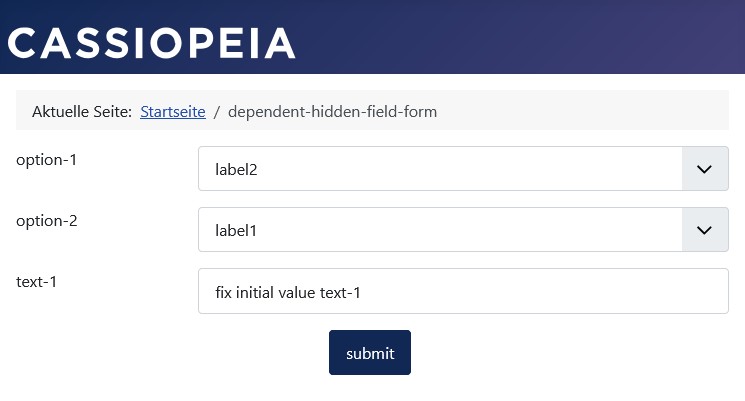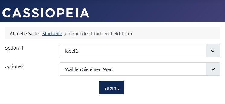 Bei Auswahl von Option label2 in Listbox-Feld option-1 wird das bedingte Feld option-2 angezeigt.