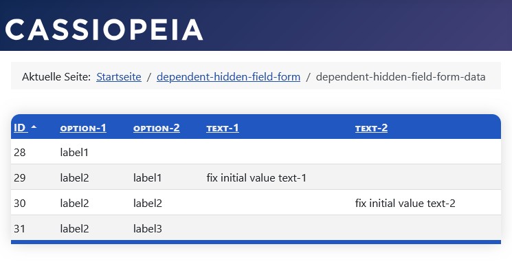 Ein weiteres Anwendungs-Beispiel mit unsichtbaren Formular-Feldern und der zusätzlichen Verwendung von SQL-Feldern finden Sie in im Abschnitt SQL-Felder » Abhängige versteckte Felder.
