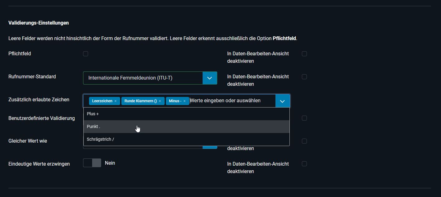 Der Feld-Typ Telefon hat insbesondere für die Validierung der Schreibweise einer Telefon-Rufnummer mehrere Möglichkeiten: