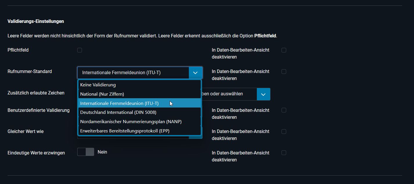 Hinweis: Eine Validierung der Schreibweise mit den beiden Rufnummer-Standards Internationale Fernmeldeunion (ITU-T) und Nordamerikanischer Nummerierungsplan (NANP) ohne Auswahl im Parameter Zusätzlich erlaubte Zeichen ist sehr streng und eignet sich besonders in Verbindung mit der Validierung im Sinne des Parameters Eindeutige Werte erzwingen.